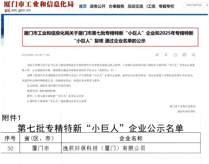 Eragon Enviro Tech (Xiamen) Co., Ltd. has recently been officially recognized as a National-Level "Little Giant" Enterprise under China's Specialized and Innovative SME program, following the review and public announcement process organized by the Ministry of Industry and Information Technology (MIIT).